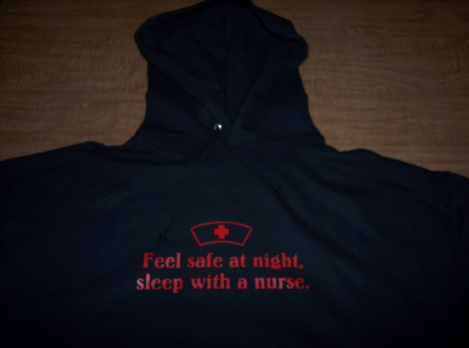 | FEEL SAFE AT NIGHT SLEEP WITH A NURSE ITEM # DB 0014 Image is about 11" x 4", on front of shirt, but can be placed anywhere on the shirt on request. Also can be made larger or smaller on request. Note: Will be SMALLER on Hats or Undies. Will be on the BACK of Undies Will Be on Back Of Zip-Up Hooded Sweatshirt |