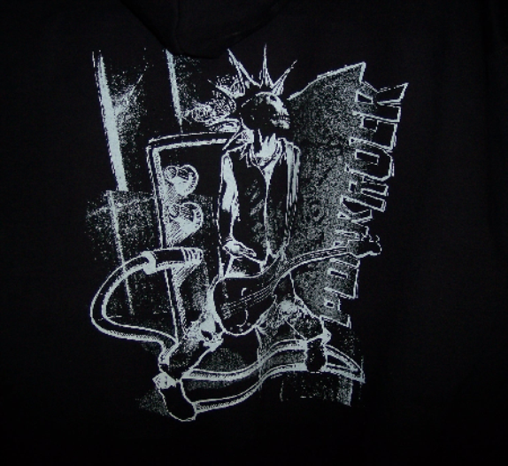 | PUNK ROCK SKELETON - ITEM # PW A9486E Image is about 12" x 14", on front of Item, but can be placed on front or back on request. NOTE: Sorry Not available on Hats or Undies Will Be on Back Of Zip-Up Hooded Sweatshirt |